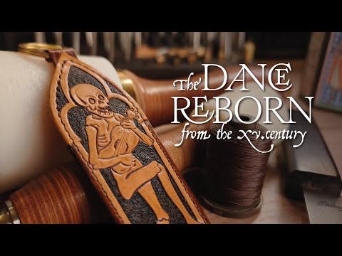Each keychain starts from the study of a 15th-century Danse Macabre xilography showing a skeleton playing strings. The scene is hand-transferred onto Italian vegetable-tanned leather, then carved with a swivel knife and shaped, strike after strike, using traditional steel stamps. Once the figure emerges in relief, the piece is hand-dyed, saddle-stitched with waxed linen thread, and finished with burnished edges and solid brass hardware.
